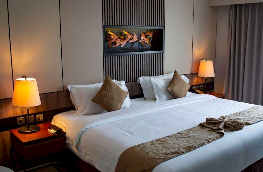 A cozy hotel room features a large bed with decorative pillows, bedside lamps, a wall-mounted decoration, and curtains covering a window.
