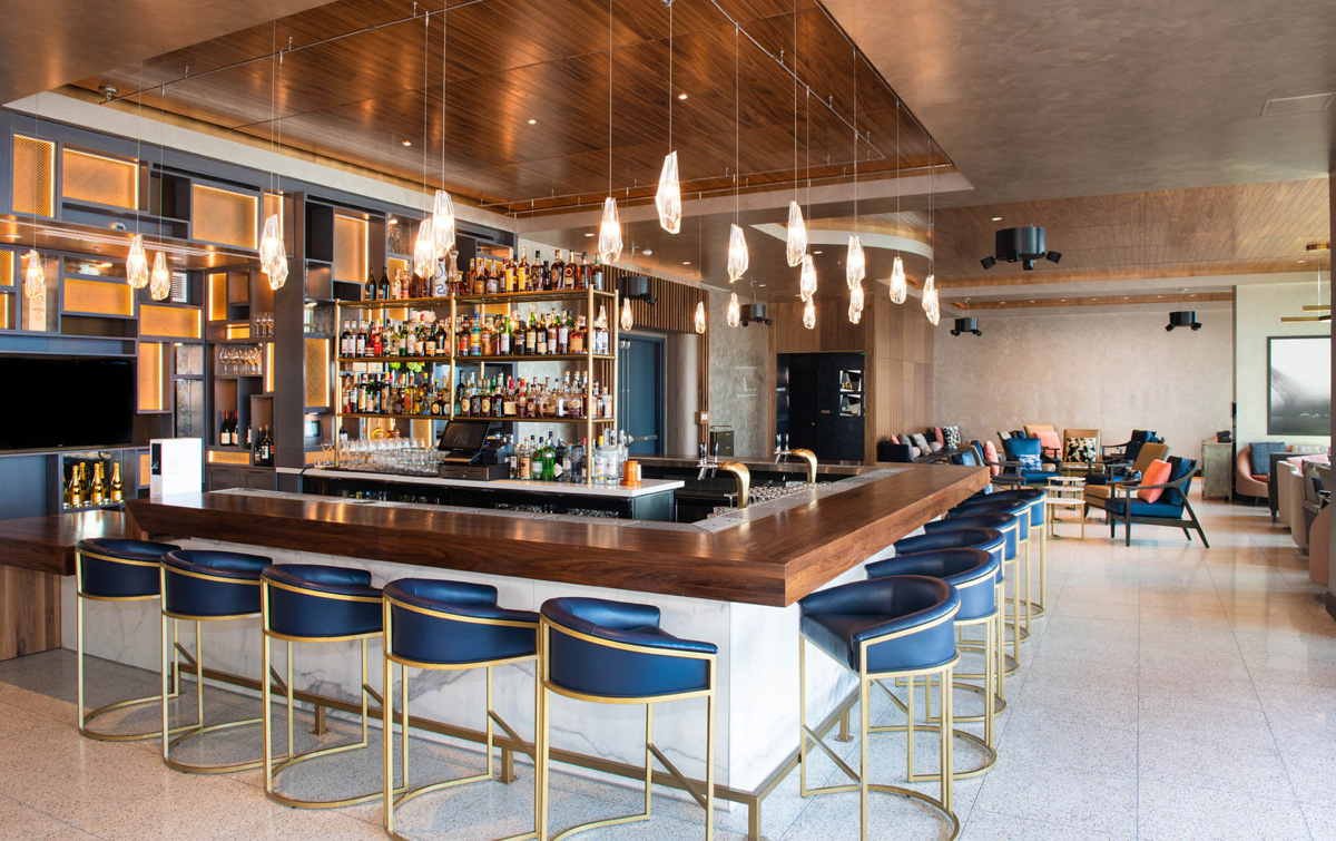 A modern, stylish bar with a long counter, blue chairs, hanging lights, and a well-stocked shelf of bottles, in a spacious lounge area.
