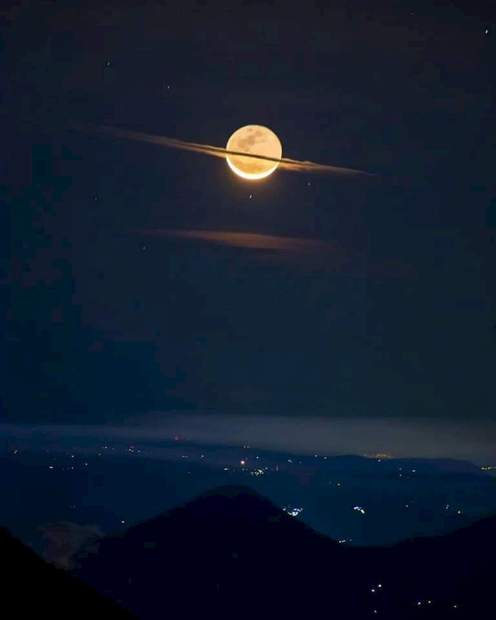 A starry night sky over a mountain landscape, with a glowing horizon and silhouetted trees, creating a serene and tranquil scene.