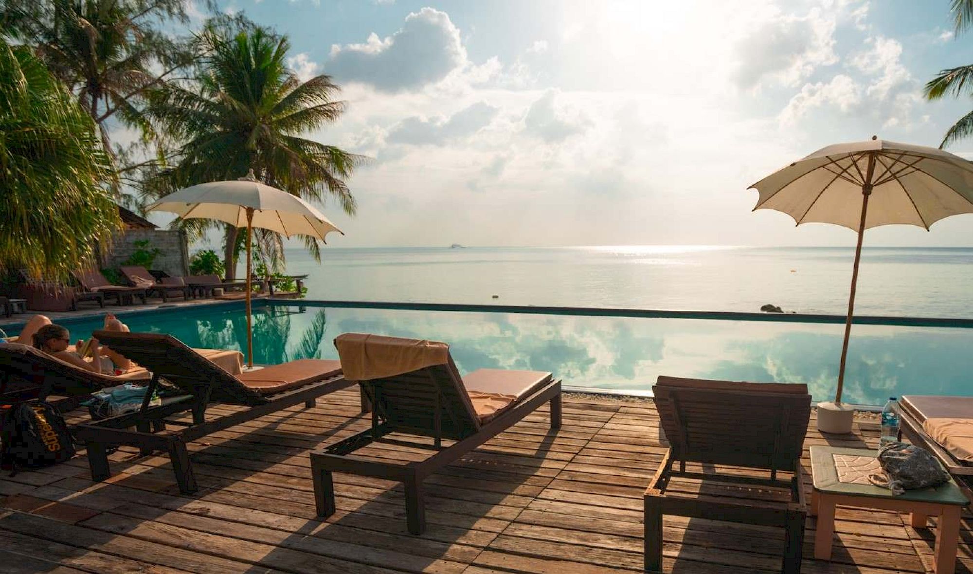 • A tranquil poolside scene with lounge chairs, umbrellas, and palm trees, overlooking a calm body of water under a sunny sky.