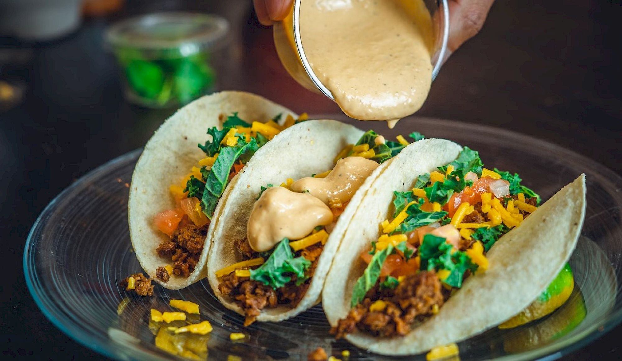 Three tacos on a plate with meat, cheese, lettuce, and tomatoes being topped with a creamy sauce.